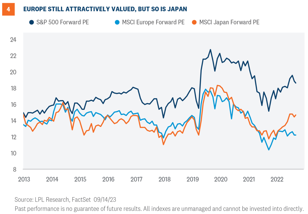 The primary reason LPL Research has slightly favored developed international equities has been their attractive valuations. European stocks compose most of the MSCI EAFE Index benchmark we use for the developed international equity asset class and, at a price-toearnings ratio (P/E) near 12, are even more attractively valued than Japan (14.8) or the broad index (13).