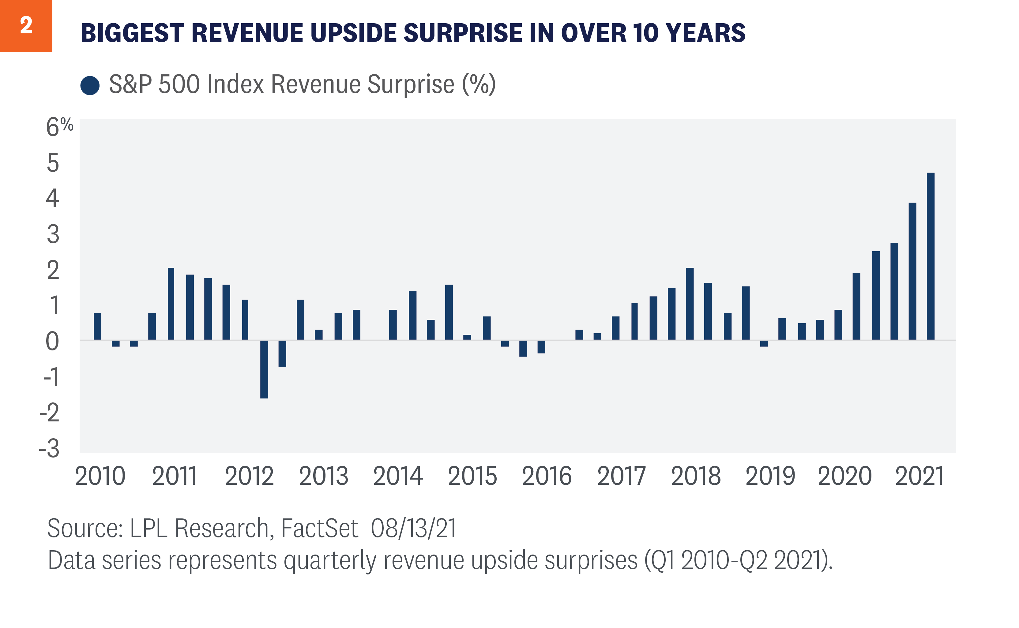 Revenue upside was especially impressive during the quarter, reflecting the improving economy and strong pricing power enjoyed by leading companies. In fact, the second quarter produced the biggest upside surprise to revenue ever recorded at 4.9 percentage points, breaking last quarter’s record of 4 points [Figure 2]. Energy more than doubled revenue year-over-year and delivered a more than 11% upside revenue surprise—the largest among all S&P 500 sectors. Revenue upside is encouraging because it is more likely to be sustained than cost cuts to prop up profit margins.