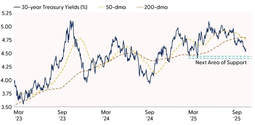 Technically, the path of least resistance for rates remains lower. Yields on 2-, 10-, and 30-year Treasuries are entrenched in accelerating downtrends. As shown in the “Long Bond Yields Breakdown to Multi-month Lows” chart, the 30-year yield recently broke below both its September lows and a key uptrend, leaving 4.42% and 4.30% as the major areas of support.