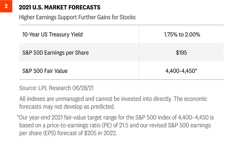 It is hard to believe we have passed the halfway point of 2021. After a 2020 that would never end, the first six months of 2021 flew by. With the second half underway, we have updated our views of the markets and economy in LPL Research’s Midyear Outlook 2021: Picking up Speed. Below we provide a summary of those expectations covering the economy, policy, stocks and bonds.